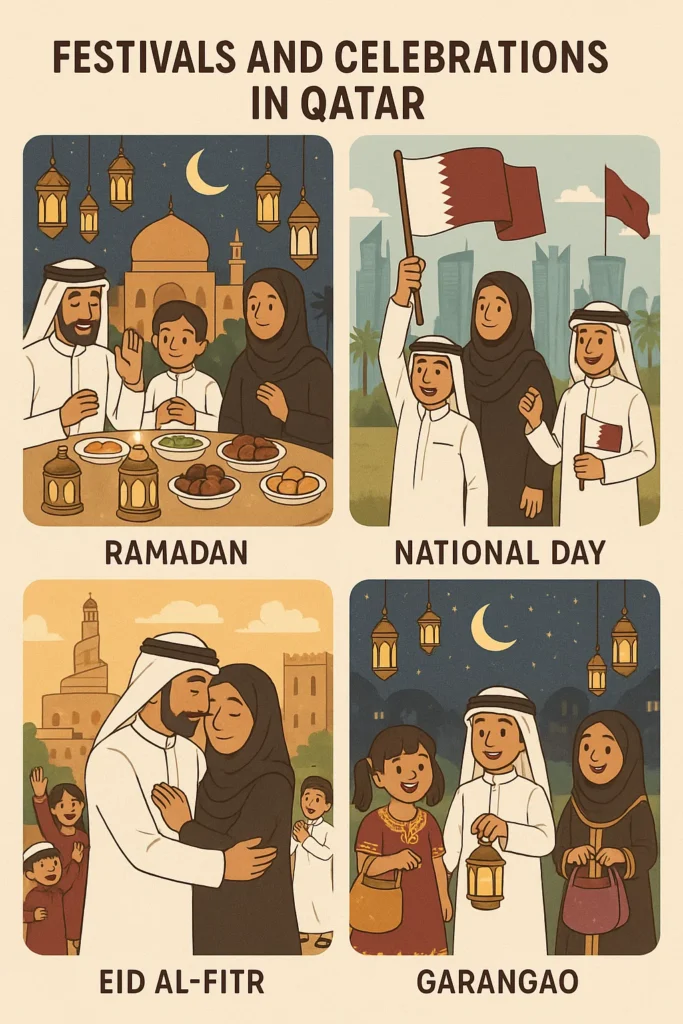 - Ramadan traditions in Qatar: The holy month is marked by fasting during the day and lavish iftar meals at night. Children celebrate Garangao, a festival midway through Ramadan when they collect sweets from neighbors.