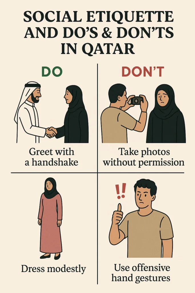 - Gender roles: While Qatar is modern, conservative values remain. Men and women often interact formally in public spaces.